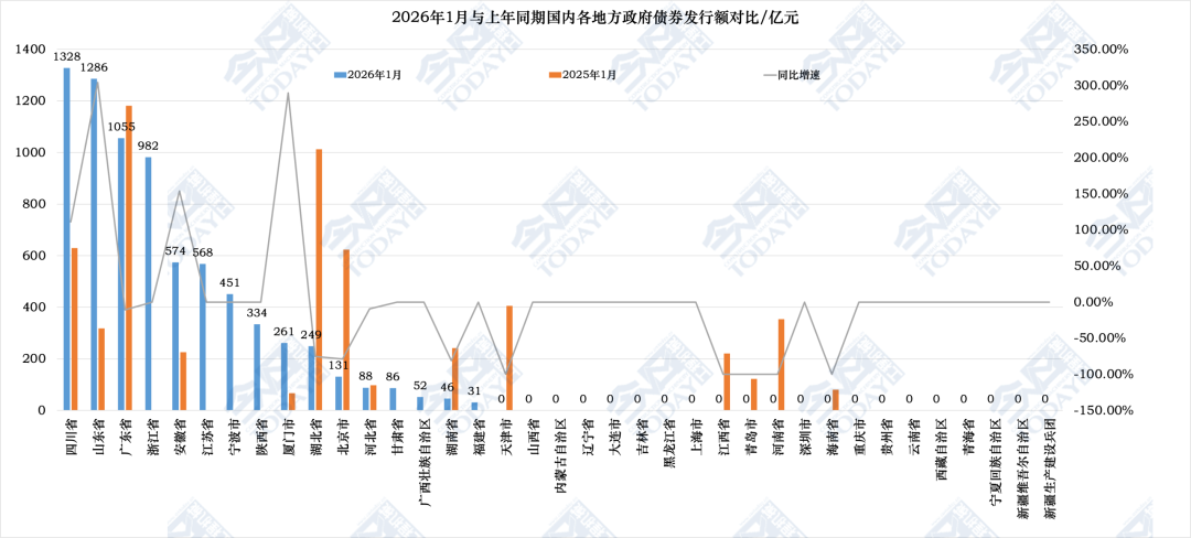 2026年1月与上年同期国内各省份地区政府债券发行额度对比