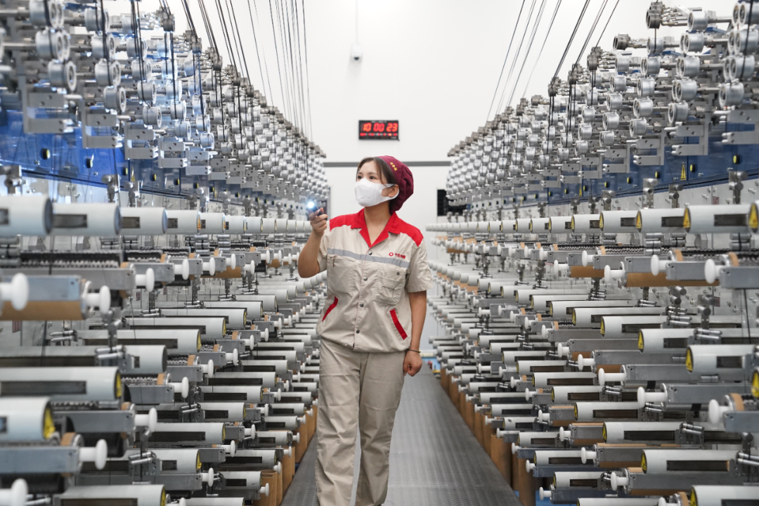 中国建材中复神鹰碳纤维生产车间,工人在检查导丝轮。(资料图片)