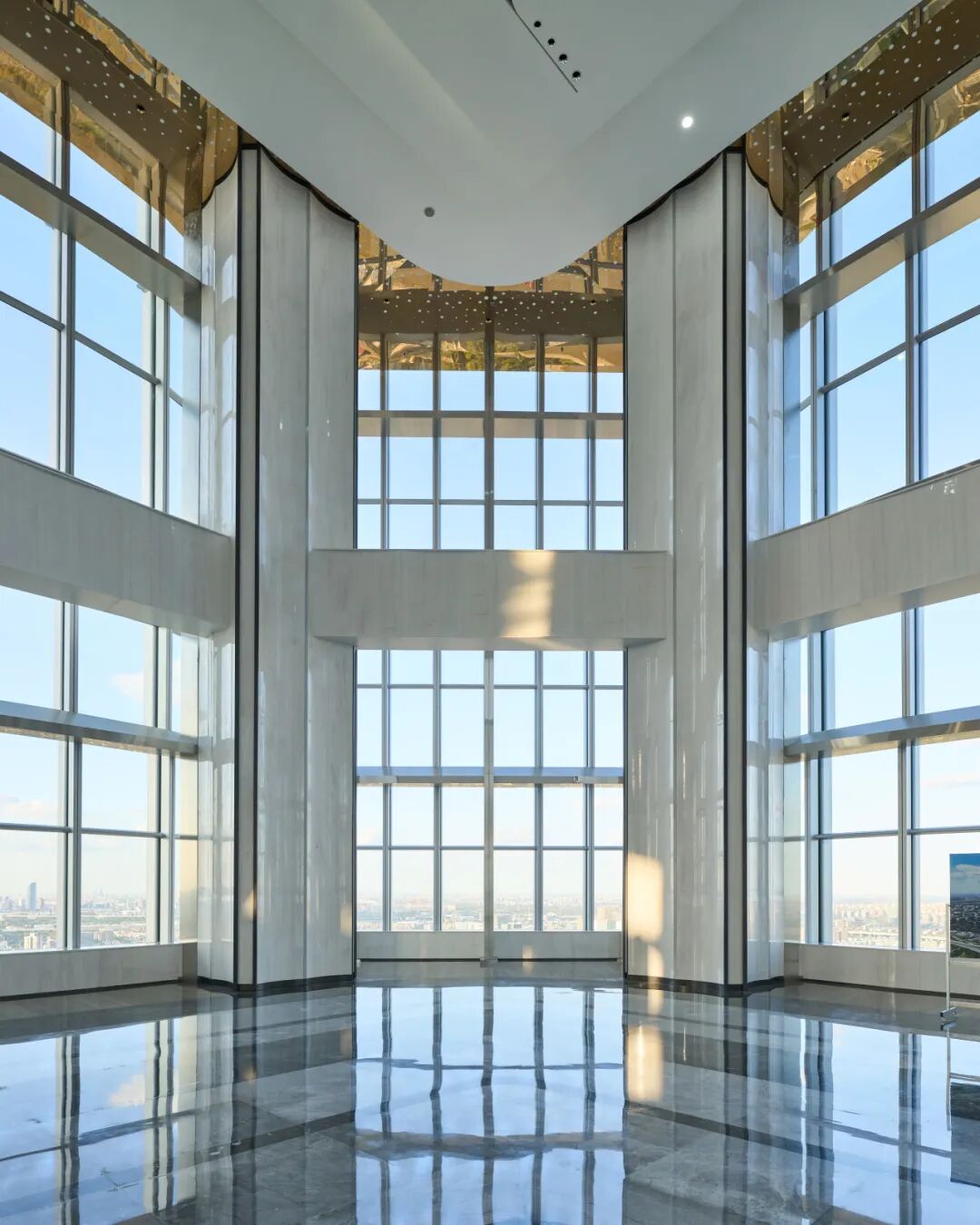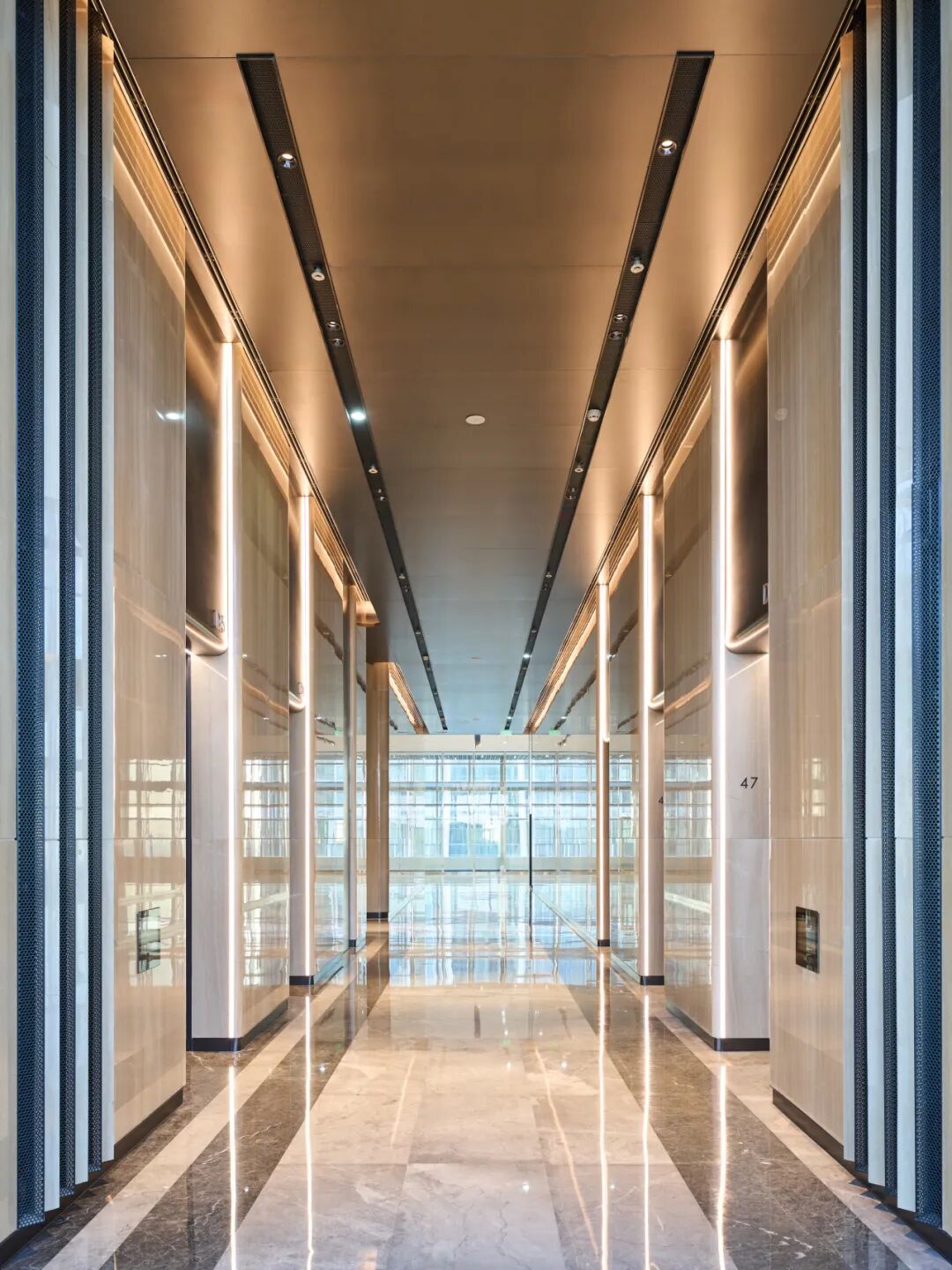 根据穿梭电梯与区间电梯运能模拟结果,奥雅纳对空中大堂和电梯分区位置进行了智能布局优化。比如,将建筑垂直划分为低、中、高多个区域,并为每个区域配备专属的电梯组。配合空中大堂设计,引导乘客乘坐高速穿梭电梯直达转换层,再换乘区间电梯,实现高效分流。该设计有效缩短了电梯行程,减少电梯数量与运行时间,从而显著提升运能效率与响应速度。