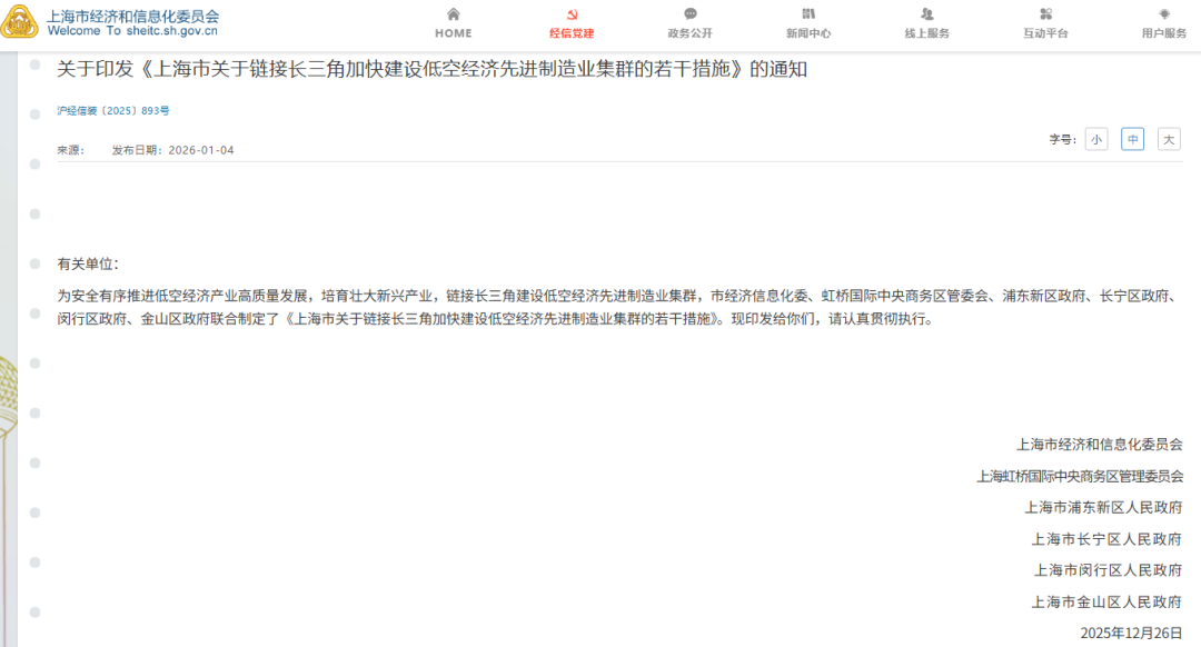 1月4日,上海市经济和信息化委员会印发关于《上海市关于链接长三角加快建设低空经济先进制造业集群的若干措施》的通知。详情如下↓