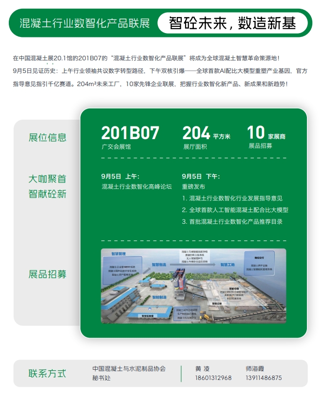 当前,许多关心混凝土行业发展的业内外人士普遍关注:我国混凝土企业距离全面实现数字化、智能化还有多远?答案将于2025年9月5日-7日在广州“广交会” 展馆揭晓。届时,国内规模领先的混凝土及其全产业链行业盛会——第七届中国混凝土展将在此隆重举行。纵观过往的历届展会,均将混凝土的数字化、智能化应用视作最重要的亮点之一,本届亦不例外。近年来,我国预拌混凝土行业在数字化、智能化转型中已取得重要突破。借助智能装备与智慧生产管理平台,行业已在质量检测、工艺优化、能碳管理及供应链协同等单点场景应用实现初步智能化,并且行业头部企业的数字化、智能化水平已跻身全球第一方阵。当然,全行业的数字化、智能化水平仍有提升的空间,智能装备技术迭代潜力巨大,智能工厂建设的基础也有待进一步夯实。本届中国混凝土展将迎来耀眼的新亮点——“混凝土行业数智化产品联展”,在这里国内混凝土与水泥制品行业以“智砼未来,数造新基”为主题,集中展示数字化、智能化高端成果。在中国混凝土展20.1馆的联展专区,观众可以零距离地观摩由10余家数字智能先锋企业联手打造的204平方米未来工厂概念展示区。9月5日上午,一批行业头部企业负责人将共聚一堂,深入探讨数字化、智能化转型路径;当日下午,展会现场将重磅发布3项关键成果,一是《混凝土行业数智化行业发展指导意见》,二是全球首款人工智能混凝土配合比大模型,三是首批《混凝土行业数智化产品推荐目录》。这些来自混凝土与水制品行业的数字化、智能化成果与举措,将有效助力业内外人士及时了解和把握行业数字化与人工智能领域的新产品、新成果和新趋势, 并成为重塑与优化行业产业生态的重要元素。目前,基于互联网+、智能产品和互联互通技术,混凝土的数字化、智能化解决方案,如数字化、智能化平台,数字化、智能化试验室及一体化成品交付解决方案等,正在构建覆盖数智工厂、自动检测、智能安环、智慧工程的数字化和智能化管理体系。该体系可实现混凝土产品从材料溯源到售后服务环节的自动化、智能化、可视化管理,将为行业提供全场景智慧赋能。一是智能生产场景。建立智能生产系统,通过视觉识别、红外定位与传感器网络,实现原材料自动称重、磅单生成、设备状态实时监控(振动/温度/压力),异常即时报警,减少人工干预。应用先进的智能视觉技术,完成物料自动化称重、异常自动报警、磅单自动生成及作弊识别等环节,实现无人化过磅与配料。基于设备运行参数分析并进行故障预判,在设备存在异常或潜在故障时,触发报警机制,实现设备运行状况的实时掌握和预测性维护。为每批次混凝土赋予“数字身份证”,客户可通过“商砼”APP实时追踪生产、运输、浇筑进度及质量报告,并支持压力机自动采集试块强度数据,确保全流程可追溯。二是智能检测场景。运用自主开发的原材料检测系统及自动化试验设备,精准复制人工试验的步骤,自动完成配套试验结果计算及报告生成。严格遵循国 家标准和规范,实现混凝土自动取样、坍落度试验、试块成型、养护、试压检测等品控工序的高度集成化与自动化。客户可通过5G服务舱大数据看板,实时查阅混凝土产品材料检测到出厂品控的全过程质量信息;通过智能调度系统,随时掌握供货站点的排队顺序、运输状态、路线规划等保供信息;通过数字化、智能化平台区的多块数智大屏实时联动,实现信息化系统对生产控制、物流运输、交货验收、现场浇筑及工程实体的全流程数字化和智能化质量监管。 三是智能施工场景。通过搭建项目应用场景运营平台,以原材料质量管理、混凝土质量管理、现场浇筑监管、服务设备管理、客户资料交付五大板块为核心,构建混凝土全过程的数字孪生信息模型,打造覆盖混凝土全生命周期的数据交付体系。智能施工机器人、激光摊铺机及抹面收光机等智能装备可分别应用于混凝土浇筑关键环节,通过精确控制结构表面的平整度,有效减少后续施 工工序,助力客户形成差异化竞争优势。当前,一家优秀的数字智能化混凝土搅拌站,其数字化、智能化亮点主要体现以下4个方面:一是生产少人化,年产5万立方米的混凝土仅需配备操作员兼 调度1名、实验室人员3名、铲车司机1名,机修工1名。二是原材料入场无人化,实现采购计划自动生成、送料车辆自主登记、无人过磅出入场、智能卸料引导及门禁控制。三是生产管理自动化与智能化,支持客户手机下单,智能调度辅助排产,生产进度及车辆位置实时推送至客户手机,试块智能养护与压力测试、试块数据自动推送至客户及质检站,显著提升透明度与信誉度,降低沟通成本。四是业财一体化,原材料供应商结算、运输司机结算、混凝土销售签收结算、收付款及发票管理等财务业务,均在一套系统内完成,实现生产信息与客户共享。 中国混凝土企业的技术发展经历了从自动化到数字化,并向智能化持续递进与升维的过程。行业的数字化、智能化转型遵循“自动化→信息化→数字化→智能化” 的演进逻辑,现阶段整体处于数字化深化与智能化起步探索的交织期,头部企业与中小企业在应用水平上呈现显著分化。 一是自动化阶段(2000年-2015年),设备与流程的基础升级。早期行业依赖人工操作,生产效率低下,质量波动显著。2000年后