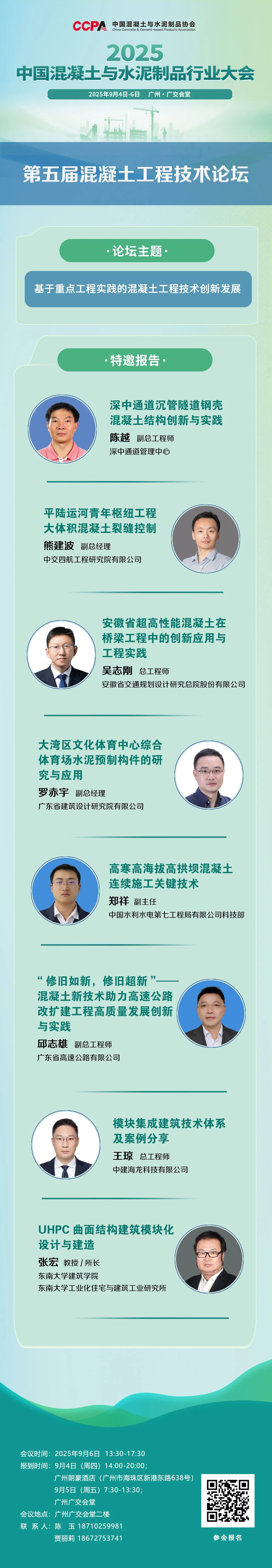 2025年9月6日,第五届混凝土工程技术论坛将于广州广交会堂盛大举行。本次论坛以“基于重点工程实践的混凝土工程技术创新发展”为主题,汇聚深中通道、平陆运河、安徽模式UHPC装配式桥梁、大湾区文体中心、叶巴滩水电站高拱坝施工、沈海高速深汕西改扩建等国家级重大项目的技术领军者,分享前沿科技成果与实战经验。