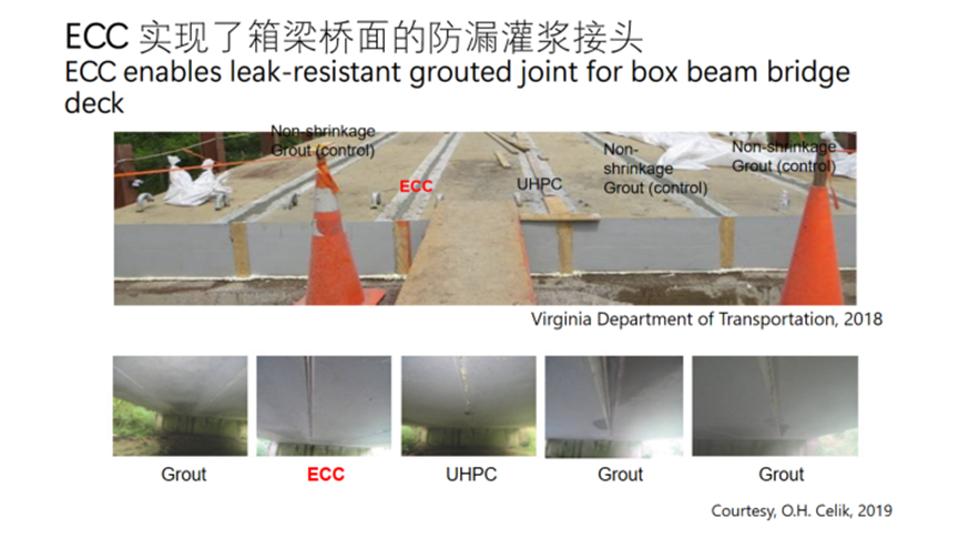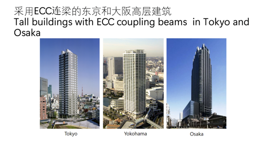 接下来,Victor C. Li教授从工程应用的角度,阐述了ECC材料的优势。在美国弗吉尼亚交通部的一个重视项目中,ECC与低收缩砂浆、超高性能混凝土应用于箱梁桥面的防漏灌浆,ECC接缝的防渗性能优于其他种类的灌浆接缝。在东京和大阪的高层建筑中,已经开始采用ECC材料制造的预制混凝土连梁,极大地降低了混凝土材料的用量,且具有优越的抗震性能。