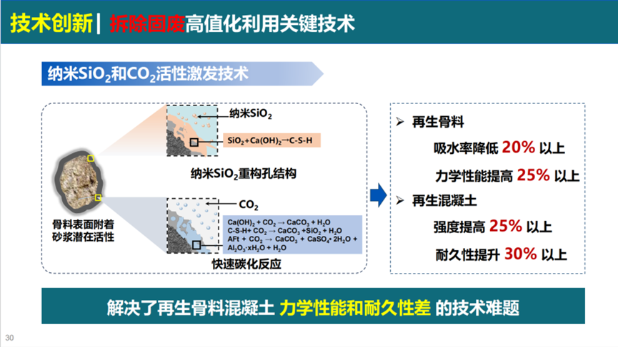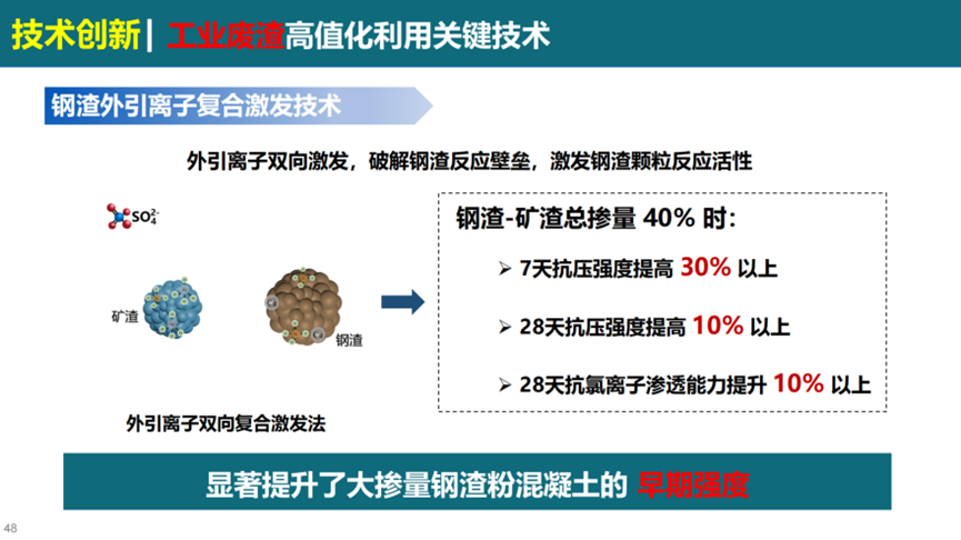 在工业废渣高值化利用关键技术中,邢锋院士介绍,工业废渣可分为一般工业废渣、危险工业废渣和生活垃圾固废三大类,经处理作为高活性废渣/飞灰、低活性废渣/飞灰和废弃块体渣,主要用于(辅助)胶凝材料、砂浆/环保转、人造骨料及混凝土中,技术创新主要包括外引离子复合激发技术、粉煤灰活性深度激发技术以及钢渣外引离子复合激发技术,并应用于天津津塔主体结构、深圳平安(金融中心)大厦主体结构等工程中。