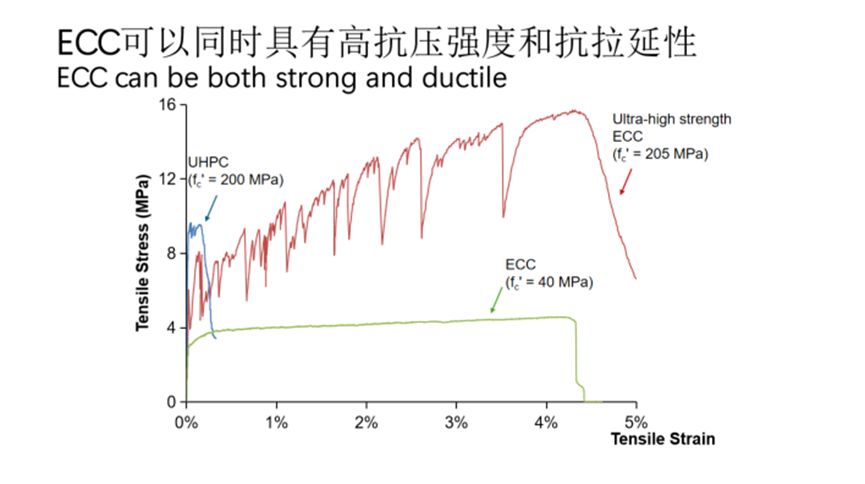 ▲ECC与普通混凝土和超高性能混凝土材料应力-应变曲线的对比