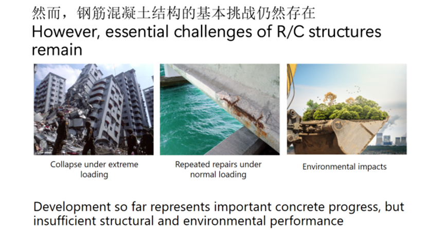 Victor C. Li教授表示,19世纪中后期钢筋混凝土材料发明以来,混凝土材料历经100多年的发展,出现了3D打印混凝土、绿色低碳混凝土乃至智能化混凝土等新型混凝土,至今还是学术界研究的热点。然而,钢筋混凝土结构的基本挑战仍然存在,混凝土本身具备的脆性特点是罪魁祸首。工程界需要一种能够全面改善混凝土脆性缺陷的新型材料,能够超越单纯材料性能范畴,兼具高韧性、耐久性与可持续性的理想的混凝土材料。