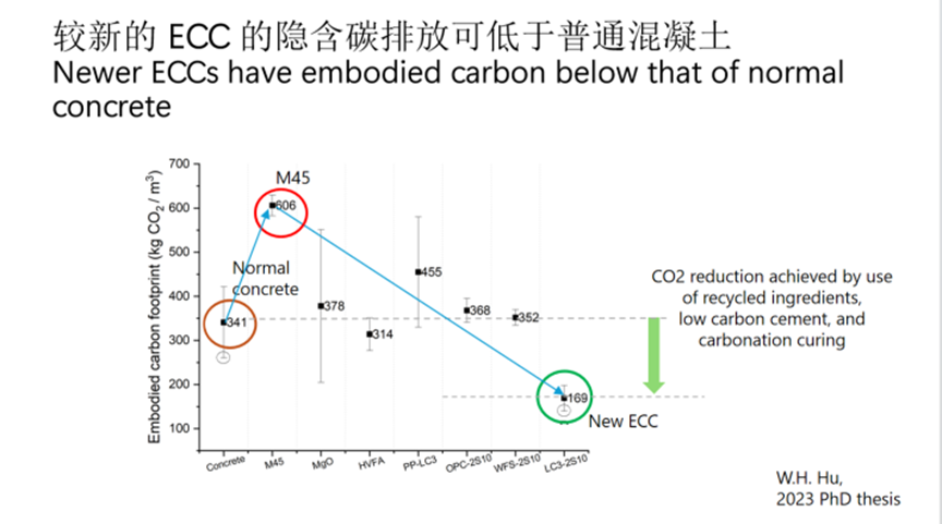 接着,Victor C. Li教授又阐述了ECC材料和结构的隐含碳排放和使用阶段碳排放的情况。他表示在材料层面,新型ECC材料已经通过固废利用、采用低碳水泥和CO2养护等手段,显著降低了隐含碳排放强度。