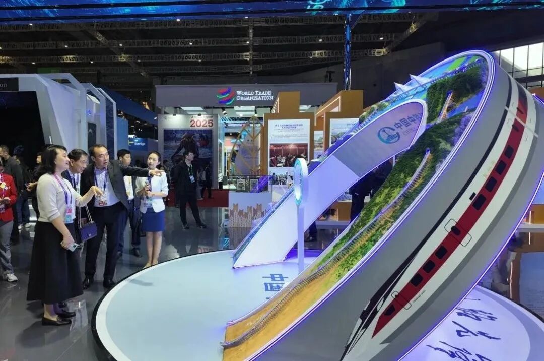 中国中铁综合数智沙盘亮相进博会中国馆,立体展示我国“城乡区域协调发展”的重大基础设施建设成就。展品以实物沙盘形式微缩复原平潭海峡公铁大桥、拉林铁路、常泰长江大桥、环塔克拉玛干沙漠铁路、郑渝高铁等5项标志性超级工程。沙盘以弧形屏为媒介,串联五个项目,按照实物工程设计图纸制作5个项目关键工程外观,以铁路路面串联,并配备高铁列车模型进行动态展示。
