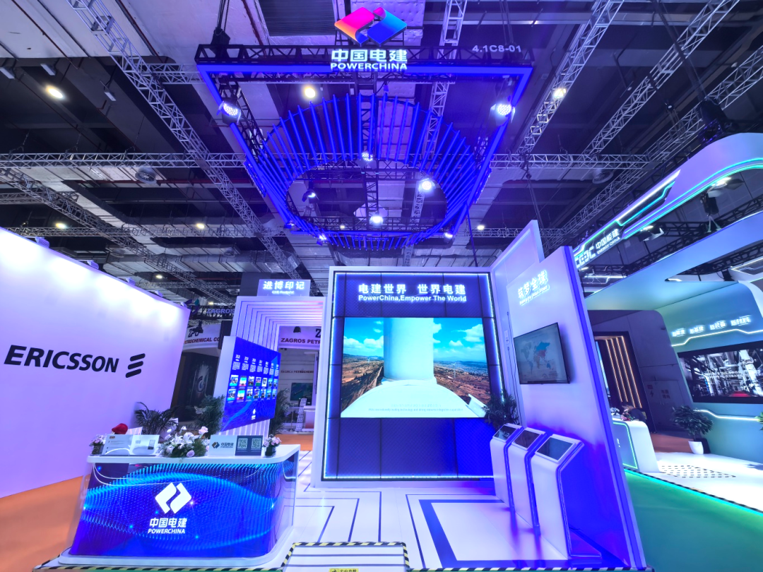 中国电建设立了“电建世界 世界电建”主题展厅,以“筑梦全球”、“进博印记”、“聚力共赢”三个模块呈现历届参会成果、国内外重大工程项目等内容,展示企业在“水、能、城、数”核心领域的综合实力。