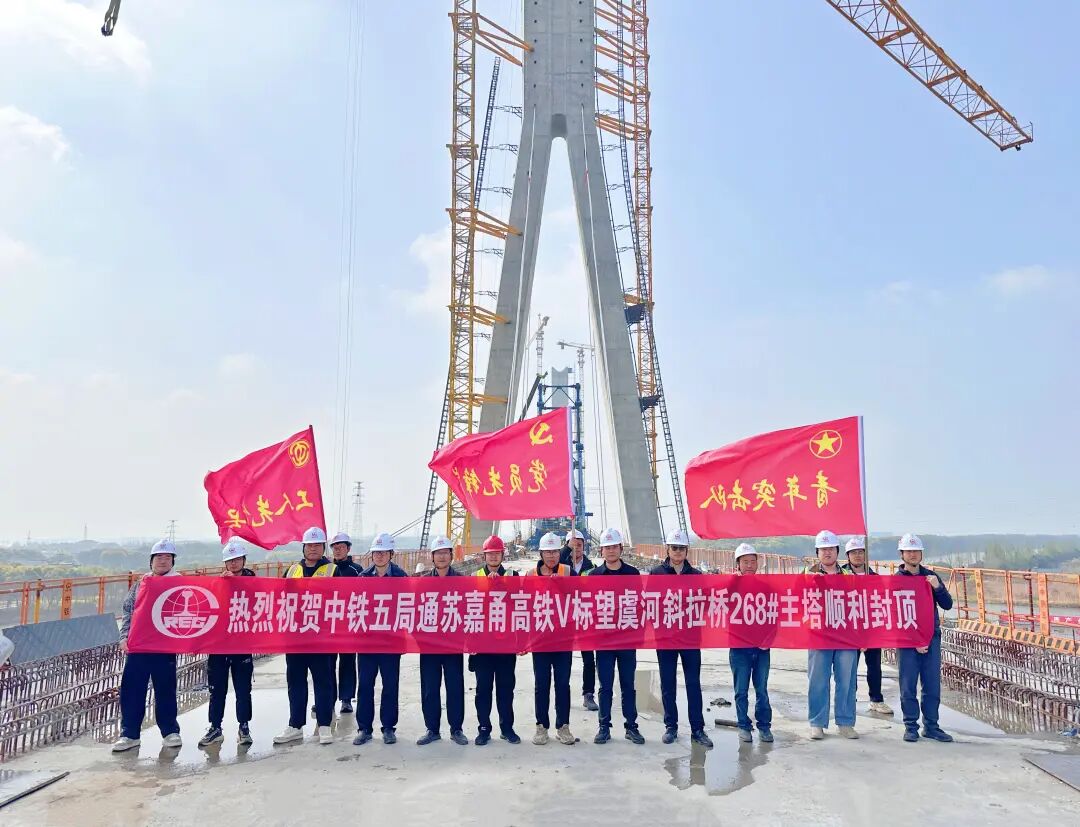 近日,由中铁五局承建的通苏嘉甬高铁V标望虞河斜拉桥268#主塔顺利封顶,项目全面转入斜拉索挂索与结合梁架设阶段,为全线按期通车筑牢了根基。